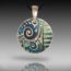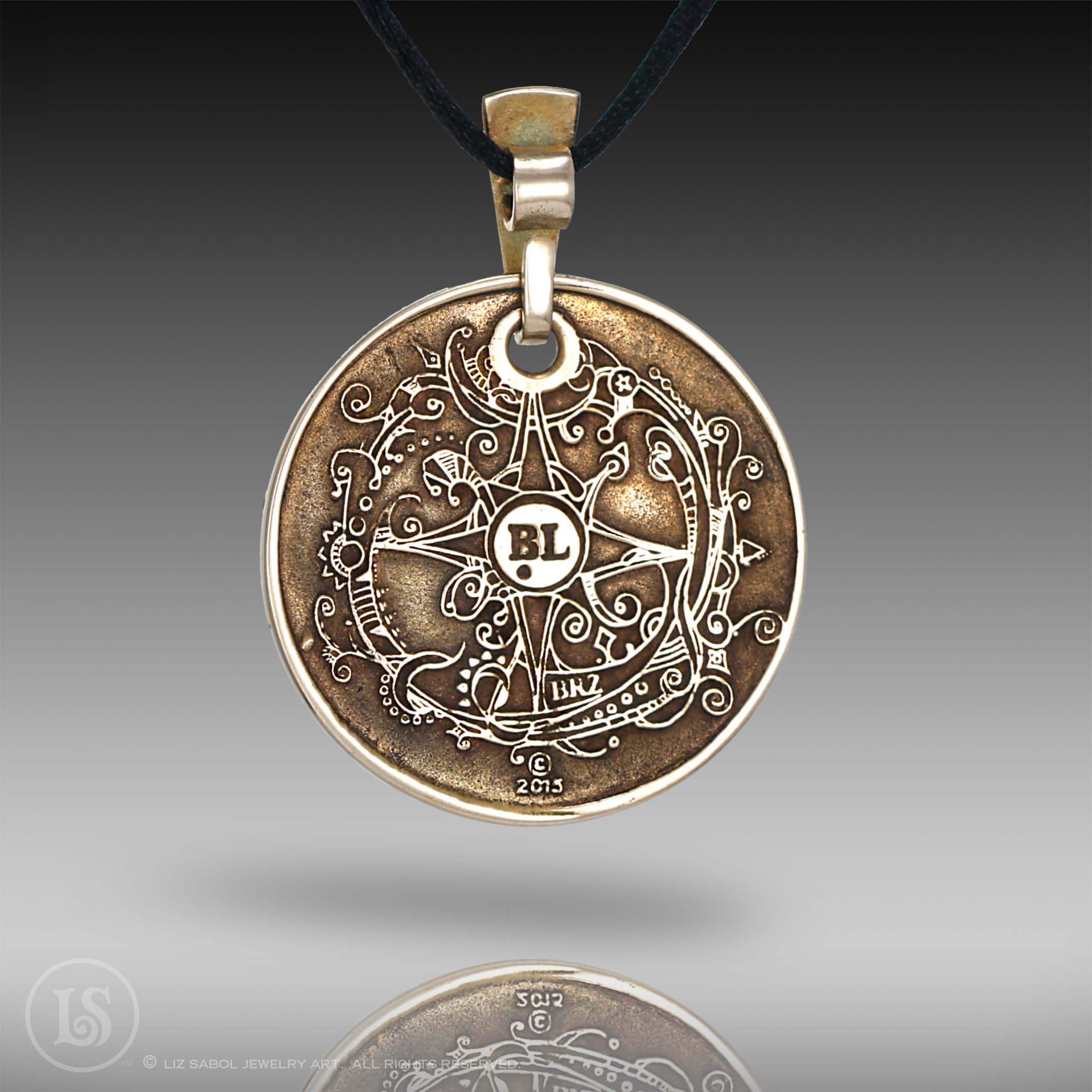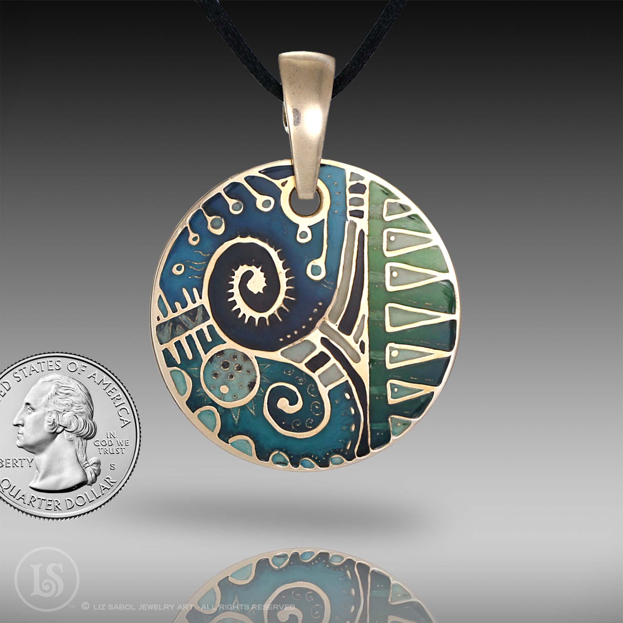 This bronze pendant is hand-crafted in bronze metal clay, hand-painted and filled with resin. The resin is sanded flush and re-polished.