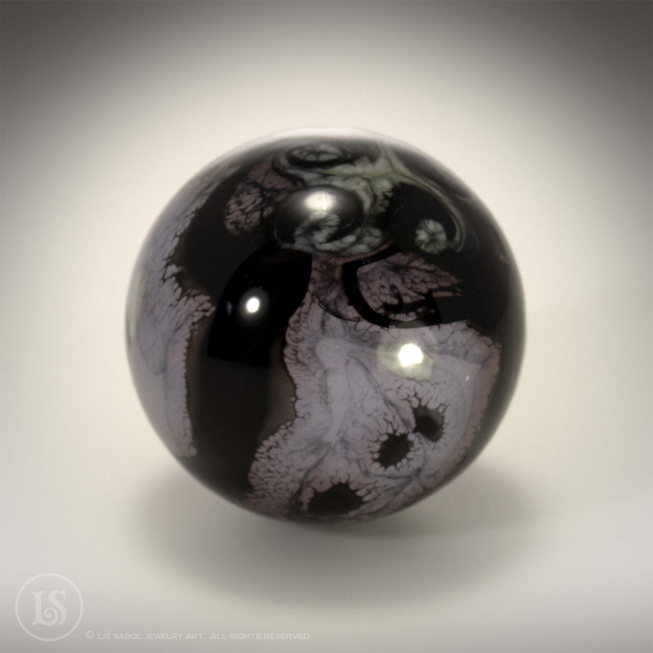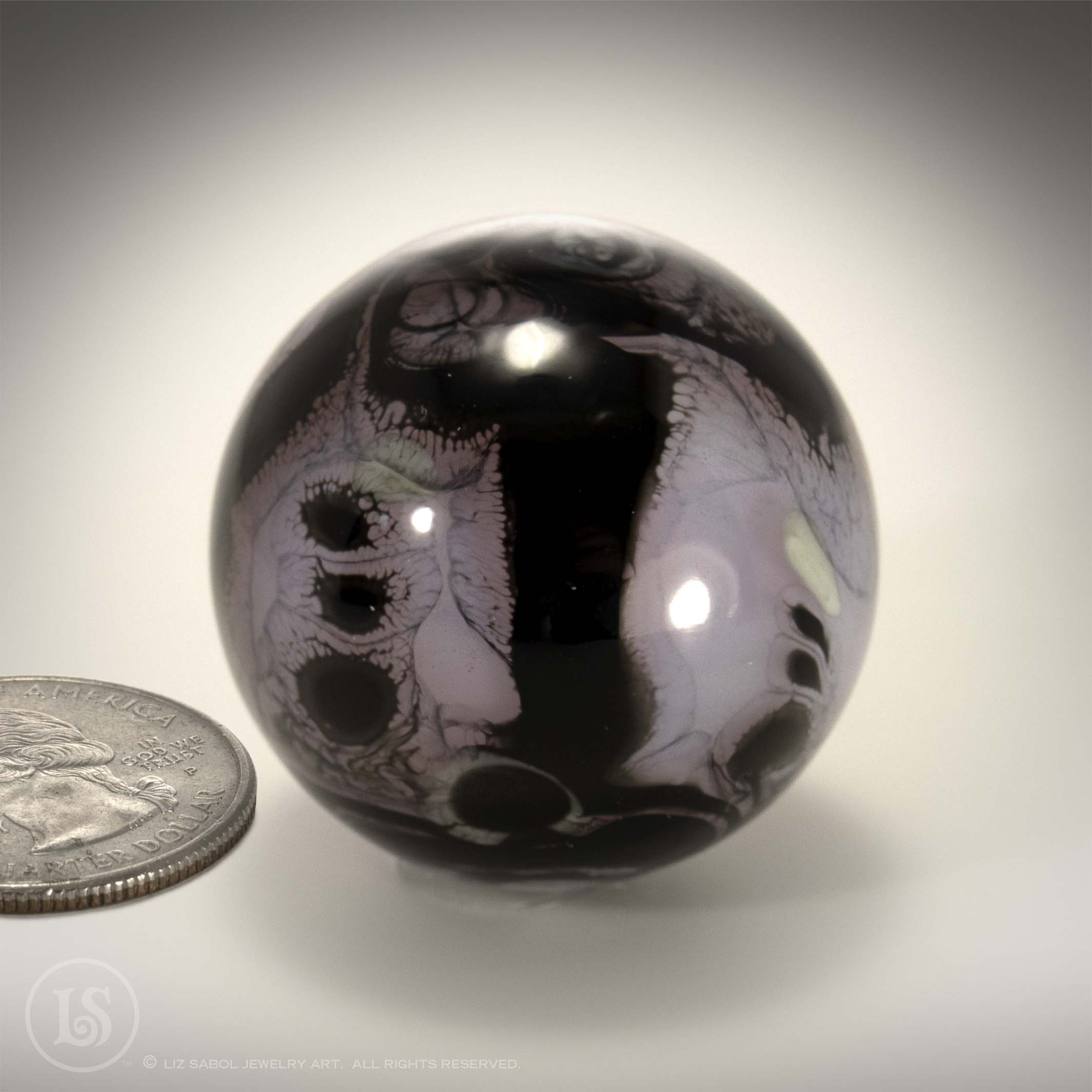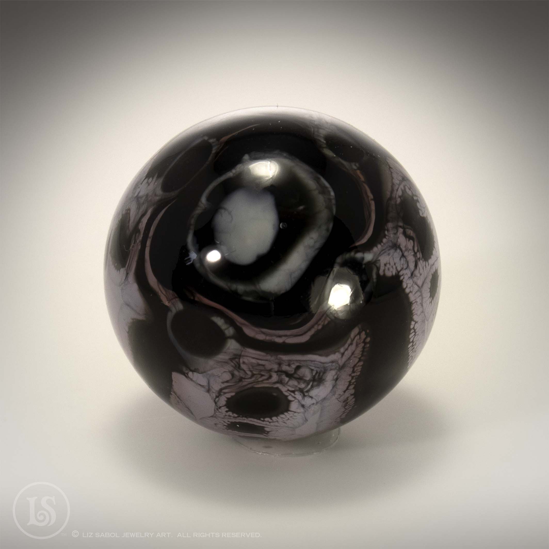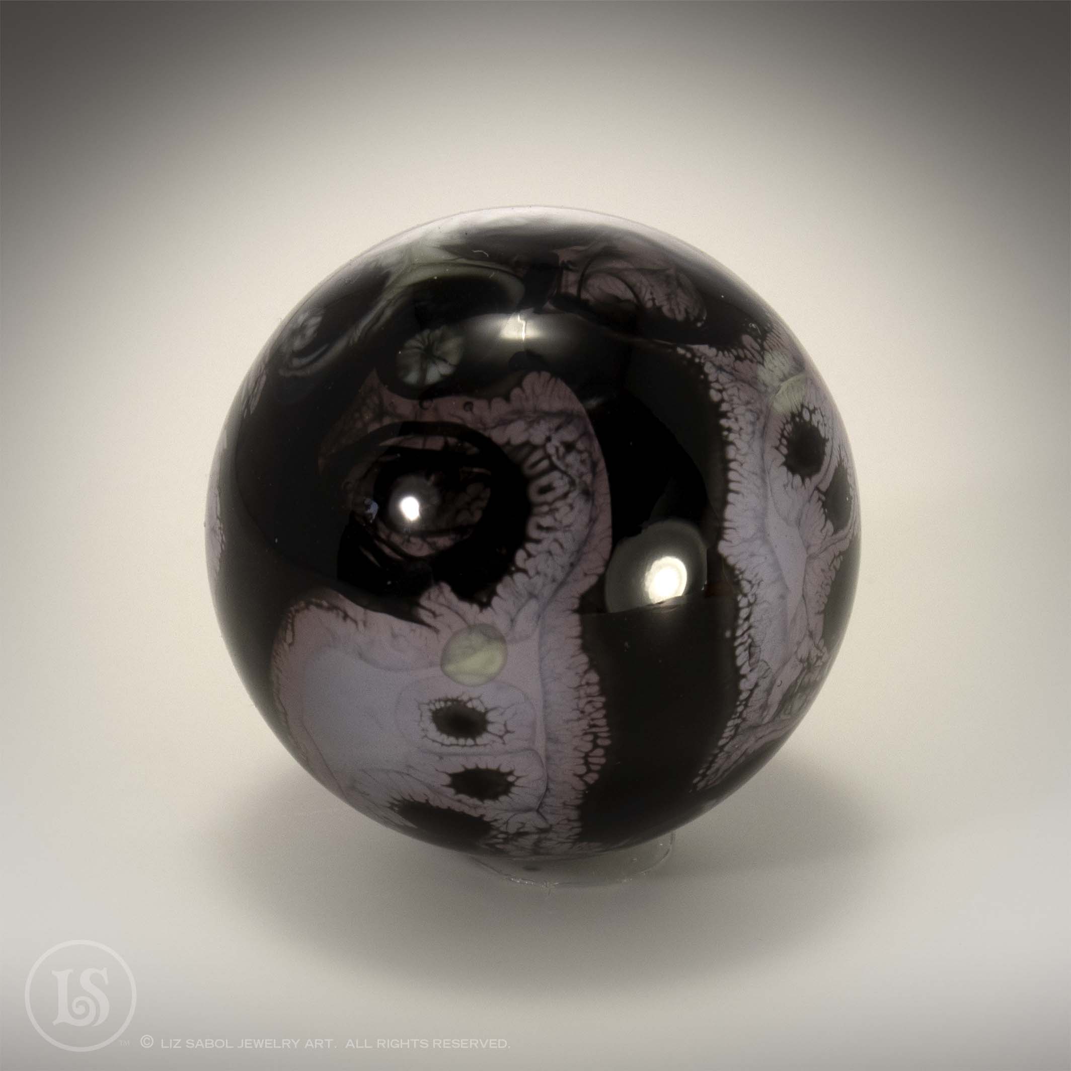 Hand-made one-of-a-kind lampworked glass marble. Signed LS on the bottom with titanium pen. A simple plastic stand is included. Hand-made bronze stands are available for purchase.